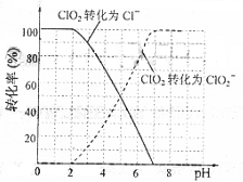 饮用水中ClO2、ClO2-的含量可用连续碘量法进行测定。ClO2被I-还原为ClO2-、Cl-的转化率与溶液pH的关系如右图所示。当pH≤2.0时,ClO2-也能被I-