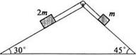 14.一固定光滑斜面的两倾角分别为300和450,质量分别为2m和m的两个滑块用不可伸长的轻绳通过滑轮连接(不计滑轮的质量和摩擦),如图分别置于倾角分别为300和450两个斜面上并由静止释放,下滑加速度为a1,轻绳张力为T1;若交换两滑块位置,再由静止释放,下滑加速度为a2,轻绳张力为T2。则在上述两种情形中正确的有 ( )