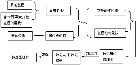 (1)形成重组DNA的过程需要的酶有 ;所谓农杆菌转化是指让其侵染植物组织细胞从而把目的基因导入植物细胞,在这个过程中 (是/不是) 所有细胞都导入了目的基因,图中的植株再生利用的是 技术,其理论基础(原理)是 ,其培养基中除含有必要的营养物质、琼脂和激素( 如: )外,还必须加入 。