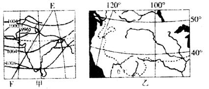 (1)甲区域出现图示气压形势季节时,气候特征是 。EF为晨昏线中的 (晨或昏)线。(2分)