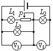 [例题19]如图所示,电源电动势为E,内电阻为r。当滑动变阻器的触片P从右端滑到左端时,发现电压表V1、V2示数变化的绝对值分别为ΔU1和ΔU2,下列说法中正确的是![]()