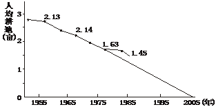 (1)从人均耕地变化曲线上看,我国的人均耕地面积在日趋________,这一趋势若不能得到有效的缓和,按1955-1975年的速度发展,大约在2020年,我国人均耕地将趋近于________。