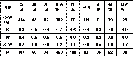 美国学者克莱因在1980年提出了一个国力方程,即P=(C+E+M)×(S+W)。并对1978年世界一些国家国力计算结果如下(P代表国力,C代表基本实体,E代表经济能力,M代表军事力量,S代表战略意图,W代表科学技术):