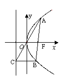 经过点F的直线交抛物线于A、B两点,点C在抛物线的准线上,且BC∥x轴,证明直线AC经过原点O![]()