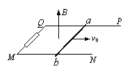 12.如图所示,光滑U型金属导轨PQMN水平固定在竖直向上的匀强磁场中.磁感应强度为B,导轨宽度为L。QM之间接有阻值为R的电阻,其余部分电阻不计。一质量为M,电阻为R的金属棒ab放在导轨上,给棒一个水平向右的初速度v0使之开始滑行,最后停在导轨上。由以上条件,在此过程中可求出的物理量有