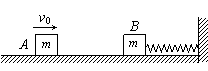 (8分)如图,在光滑的水平面上,有质量均为m的A、B两个物体。B与轻弹簧一端相连,弹簧的另一端固定在墙上。开始弹簧处于原长。A以一定的速度与B发生正碰,碰撞时间极短。碰后两物体以相同的速度压缩弹簧,弹簧的最大弹性势能为Ep。不计一切摩擦。求碰撞前物体A的速度v0。