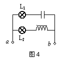 两个相同的白炽灯泡L1和L2接到如图4所示的电路中,灯L1与电容器串联,灯L2与电感线圈串联。当a、b间处接电压最大值为Um、频率为f的正弦交流电源时,两灯都发光,且亮度相同。更换一个新的正弦交流电源后,灯L1的亮度低于灯L2的亮度。新电源两极的电压最大值和频率可能是( )