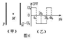 如图6(甲)所示,两个平行金属板P、Q正对竖直放置,两板间加上如图6(乙)所示的交变电压。t=0时,Q板比P板电势高U0,在两板的正中央M点有一电子在电场力作用下由静止开始运动(电子所受重力可忽略不计),已知电子在0~4t0时间内未与两板相碰。则电子速度方向向左且速度大小逐渐增大的时间是( )