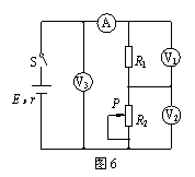 3.在如图6所示电路中,电源电动势为E,内阻为r,电流表A、电压表V1、V2、V3均为理想电表,R1为定值电阻,R2为滑动变阻器。闭合开关S,当R2的滑动触头P向上滑动的过程中