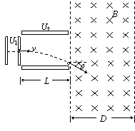 1.(崇文区)如图所示,一带电微粒质量为m=2.0×10-11kg、电荷量q=+1.0×10-5C,从静止开始经电压为U1=100V的电场加速后,水平进入两平行金属板间的偏转电场中,微粒射出电场时的偏转角θ=30º,并接着进入一个方向垂直纸面向里、宽度为D=34.6cm的匀强磁场区域。已知偏转电场中金属板长L=20cm,两板间距d=17.3cm,重力忽略不计。求: