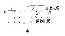 (东城区)2.在甲图中,带正电粒子从静止开始经过电势差为U的电场加速后,从G点垂直于MN进入偏转磁场。该偏转磁场是一个以直线MN为上边界、方向垂直于纸面向外的匀强磁场,磁场的磁感应强度为B,带电粒子经偏转磁场后,最终到达照相底片上的H点.测得G、H间的距离为 d,粒子的重力可忽略不计。
