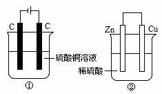 B.①中阴极质量增加,②中正极质量减小