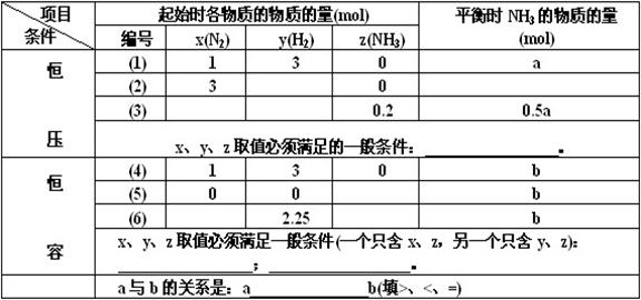 已知加入1 mol N2和3 mol H2,在恒压条件下,达到平衡时生成a mol NH3[见下表中编号(1)的一行];在恒容条件下,达到平衡时生成b mol NH3[见下表中编号(4)的一行]。若相同条件下,达到平衡时混合物中各组分的百分含量不变,请填空: