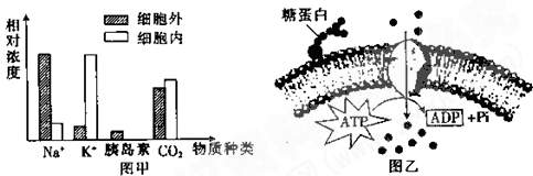 24.图甲表示四种不同的物质在一个动物细胞内外的相对浓度差异。其中通过图乙所示的过程来维持细胞内外浓度差异的物质是 ( )