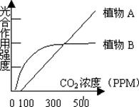 右图表示在一定的光照强度下植物A和B在不同CO2浓度下光合作用强度的变化,据图分析,下列叙述中正确的是 ( )