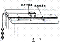 (10分)某实验小组利用拉力传感器和速度传感器探究“动能定理”,如图12,他们将拉力传感器固定在小车上,用不可伸长的细线将其通过一个定滑轮与钩码相连,用拉力传感器记录小车受到拉力的大小。在水平桌面上相距50.0cm的A、B两点各安装一个速度传感器记录小车通过A、B时的速度大小。小车中可以放置砝码。