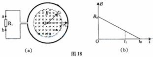 18. (15分)如图18(a)所示,一个电阻值为R ,匝数为n的圆形金属线与阻值为2R的电阻R1连结成闭合回路。线圈的半径为r1 . 在线圈中半径为r2的圆形区域存在垂直于线圈平面向里的匀强磁场,磁感应强度B随时间t变化的关系图线如图18(b)所示。图线与横、纵轴的截距分别为t0和B0 . 导线的电阻不计。求0至t1时间内