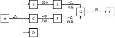 (5分)下图中A-H和甲、乙、丙分别是初中化学常见的物质。已知甲和G均为黑色固体单质,D是大理石的主要成分,丙常用来配制农药波尔多液,常温下C、E、F均为无色气体(图中有部分生成物未标出)。