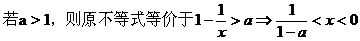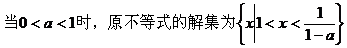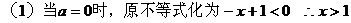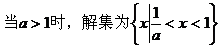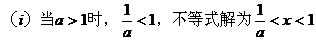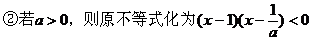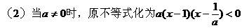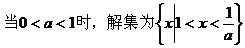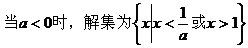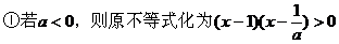 分析:这是一个含参数a的不等式,一定是二次不等式吗?不一定,故首先对二次项系数a分类:(1)a≠0(2)a=0,对于(2),不等式易解;对于(1),又需再次分类:a>0或a<0,因为这两种情形下,不等式解集形式是不同的;不等式的解是在两根之外,还是在两根之间。而确定这一点之后,又会遇到1与