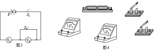 ⑵为了测量两节串联干电池的电动势,某同学设计了如图3所示的实验电路。其中:E是待测电池组,内阻不能忽略;V1、V2是两只量程都合适的电压表,内阻不是很大,且未知;S1、S2是单刀单掷开关;导线若干。