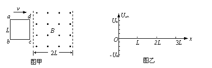 24.(18分)如图甲所示,空间有一宽为2L的匀强磁场区,磁感应强度为B,方向垂直纸面向外。abcd是由均匀电阻丝做成的边长为L的正方形线框,总电阻为R。线框以垂直磁场边界的速度v匀速通过磁场区域。在运动过程中,线框ab、cd两边始终与磁场边界平行。设线框刚进入磁场的位置x=0,x轴沿水平方向向右。求:
