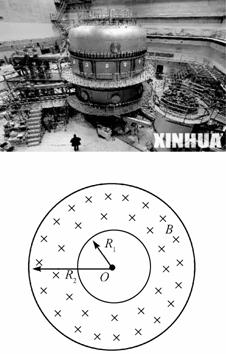 可控全超导核聚变装置从内到外有五层部件构成,比较复杂。现在按下面的简化模型来讨论这个问题:如图所示,设想最关键的环状磁容器是一个横截面为环形的区域:内径为R1,外径为R2,区域内有垂直于截面向里的磁感强度为B的匀强磁场。