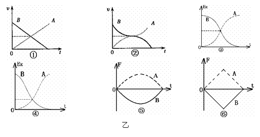 运动。物块B与弹簧作用过程中,两物块始终保持在同一条直线上运动,乙图分别描绘了此过程A、B两物体的速度V、动能Ek及所受弹力F随时间t的变化规律。能正确表示其关系的一组图像是