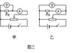 (2)第二步中甲、乙两位同学用以下器材测量电阻Rx的阻值,他们各自设计的实验电路图如图二所示。