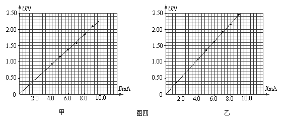(4)甲、乙两位同学各自用自己设计的电路进行了测量,并分别利用实验中记录的6组数据画出U-I图线,如图四所示。请根据你所选择的方案由图线算出被测电阻的阻值