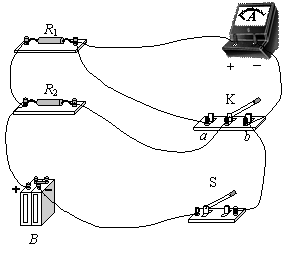 (2)某同学要测定电源B的电动势E和内电阻r,除了一只安培表外(内电阻极小可忽略不计),又找到的两个电阻,其中一个电阻的阻值R1是已知的,另一个电阻的阻值R2是未知的,一个单刀双掷开关K、一个单刀单掷开关S以及若干导线。