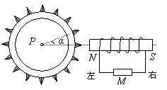 现代汽车中有一种先进的制动系统--防抱死(ABS)系统。它有一个自动控制刹车系统的装置,原理如图。铁质齿轮P与车轮同步转动。右端有一个绕有线圈的的磁体,M是一个电流检测器。当车轮带动齿轮转动时,线圈中会产生感应电流。这是由于齿靠近线圈时被磁化,使通过线圈的磁通量增大,齿离开线圈时又使磁通量减小,从而能使线圈中产生感应电流。这个电流经电子装置放大后能控制制动机构。齿轮P从图示位置按顺时针方向转过α角的过程中,通过M的感应电流的方向是