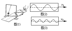 图(1)是利用砂摆演示简谐运动图象的装置。当盛砂的漏斗下面的薄木板被水平匀速拉出时,做简谐运动的漏斗漏出的砂在板上形成的曲线显示出砂摆的振动位移随时间变化的关系。第一次以速度v1匀速拉动木板,图(2)给出了砂摆振动的图线;第二次使砂摆的振幅减半,再以速度v2匀速拉动木板,图(3)给出了砂摆振动的图线。由此可知,砂摆两次振动的周期T1和T2以及拉动木板的速度v1和v2的关系是