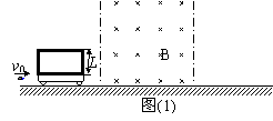 (20分) 在质量为M=1kg的小车上, 竖直固定着一个质量为m=0.2kg,宽L=0.05m、总电阻R=100Ω的n=100匝矩形线圈.线圈和小车一起静止在光滑水平面上,如图(1)所示。现有一子弹以v0=110m/s的水平速度射入小车中,并立即与小车(包括线圈)一起运动,速度为v1=10m/s.随后穿过与线圈平面垂直,磁感应强度B=1.0T的水平有界匀强磁场,方向垂直纸面向里,如图所示。已知子弹射入小车后,小车运动的速度v随车的位移s变化的v-s图象如图(2)所示.求: