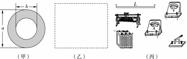 (2)(14分)如图(甲)所示,有一根细长、均匀中间空心的合金圆管线材料,材料横截面的内外轮廓均为同心圆形,外圆直径a约为1mm,材料长度L约为40cm,电阻约为300Ω左右(以上三个数据皆为粗约值,具体还需要精确测量之)。已知这种合金的电阻率为ρ,因管线内径太小,无法直接测量之,请设计一个实验方案能测量其内圆直径b,现有如下器材可以选用: