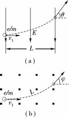 Ⅰ. 使电子以初速度v1垂直通过宽为L的匀强电场区域,测出偏向角θ,已知匀强电场的场强大小为E,方向如图(a)所示;