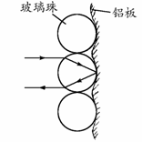 逆向返回,标志牌上的字特别醒目。这种“回归反光膜”是用球体反射原件制成的,如图所示,反光膜内均匀分布着直径为10µm的细玻璃珠,所用玻璃的折射率为