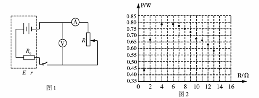 (3)电源的输出功率与外电路的电阻R有关,如图1所示是研究它们关系的实验电路。R0为保护电阻,R0与电池串联,它们一起可看作一个等效电源(图中虚线框),此等效电源的内阻r就是电池的内阻和定值电阻R0之和,等效电源的电动势为E。(电流表、电压表看作理想电表)