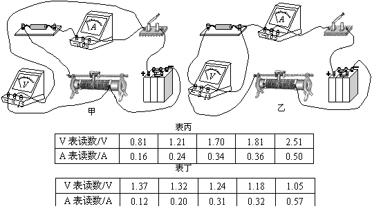 ② 上面的表丙和丁是利用上面第(1)题中的实物图且当滑动变阻器的滑动触头逐渐向右移动时依次测得的实验数据表,其中与甲图对应的表格是____表.