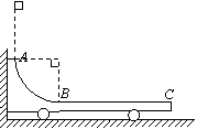 (16分)如图所示,水平光滑地面上停放着一辆小车,左侧靠在竖直墙壁上,小车的四分之一圆弧轨道是光滑的,在最低点B与水平轨道BC相切,BC的长度是圆弧半径的10倍,整个轨道处于同一竖直平面内。可视为质点的物块从A点正上方某处无初速下落,恰好落入小车圆弧轨道滑动,然后沿水平轨道滑行至轨道末端C处恰好没有滑出。已知物块到达圆弧轨道最低点B时对轨道的压力是物块重力的9倍,小车的质量是物块的3倍,不考虑空气阻力和物块落入圆弧轨道时的能量损失。求:⑴物块开始下落的位置距水平轨道BC的竖直高度是圆弧半径的几倍?⑵物块与水平轨道BC间的动摩擦因数μ。