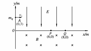 (18分)如图所示,在直角坐标系xoy的第一象限中分布着沿y轴负方向的匀强电场,在第四象限中分布着方向向里垂直纸面的匀强磁场。一个质量为m、带电+q的微粒,在A点(0,3)以初速度v0=120m/s平行x轴射入电场区域,然后从电场区域进入磁场,又从磁场进入电场,并且先后只通过x轴上的p点(6,0)和Q点(8,0)各一次。已知该微粒的比荷为