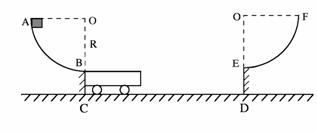 24.(20分)如图所示,固定在地面上的光滑圆弧轨道AB、EF,他们的圆心角均为90°,半径均为R。一质量为m 、上表面长也为R的小车静止在光滑水平面CD上,小车上表面与轨道AB、EF的末端B、E相切。一质量为m的物体(大小不计)从轨道AB的A点由静止下滑,由末端B滑上小车,小车在摩擦力的作用下向右运动。当小车右端与壁DE刚接触时,物体m恰好滑动到小车右端相对于小车静止,同时小车与DE相碰后立即停止运动但不粘连,物体则继续滑上圆弧轨道EF,以后又滑下来冲上小车。求: