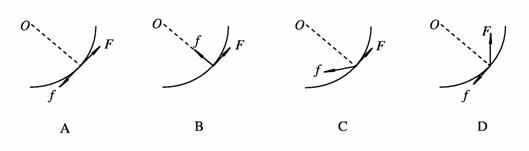 16.一只小狗拉雪橇沿位于水平面内的圆弧形道路匀速行使,如图所示画出了雪橇受到牵引力F和摩擦力f的可能方向的示意图,其中表示正确的图是