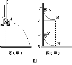后来,他又用图(乙)所示装置做实验,两个相同的弧形轨道M、N,分别用于发射小铁球P、Q,其中M的末端是水平的,N的末端与光滑的水平板相切;两轨道上端分别装有电磁铁C、D,调节电磁铁C、D的高度,使AC=BD,从而保证小球P、Q在轨道出口处的水平初速度v0相等。现将小球P、Q分别吸在电磁铁C、D上,然后切断电源,使两小球能以相同的初速度v0同时分别从轨道M、N的下端射出。实验可观察到的现象应该是 ,仅改变弧形轨道M的高度(AC距离保持不变),重复上述实验,仍能观察到相同的现象,这说明 。