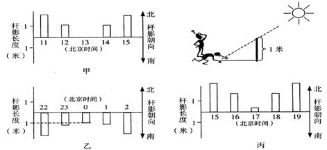 三地同学共同开展一个“影子长度”的探究学习活动,他们在当地时间10:00-14:00每隔一小时测量一根1米长的杆的影子长度,并将所得数据绘制成图。下图为6月22日三个地区同学所提供的观测结果。回答50-51题。