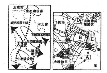 (3)在上面的右图中A,B,C,D,E各处规划建设先进制造业产业区、滨海高新技术产业区、滨海化工区、中心商务商业区、海港物流区,则正确的布局是: