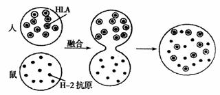 32.一系列实验证明细胞膜具有流动性。荧光抗体免疫标记实验就是其中的一个典型例子。下图表示了人、鼠细胞融合的过程,研究中分别将带有绿色荧光、能与人体细胞膜上HLA抗原特异性结合的抗体和带有红色荧光、能与小鼠细胞膜上H-2抗原特异性结合的抗体放入细胞培养液中,对人、鼠细胞进行标记。下列有关该实验的叙述错误的是