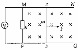 =0.5,导轨电阻不计,现用F=0.7N的恒力水平向右拉ab,使之从静止开始运动,经时间t=2s后,ab开始做匀速运动,此时电压表示数U=0.3V。重力加速度g取10m/s2。