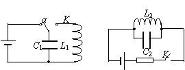 右边两图中电容器的电容都是C=4×10-6F,电感都是L=9×10-4H,左图中电键K先接a,充电结束后将K扳到b;右图中电键K先闭合,稳定后断开。两图中LC回路开始电磁振荡t=3.14×10-4s时刻,C1的上极板正在____电(充电还是放电),带_____电(正电还是负电);L2中的电流方向向____(左还是右),磁场能正在_____(增大还是减小)。