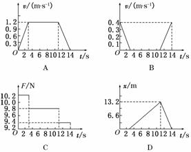 9.(2010·淮安模拟)在由静止开始向上运动的电梯里,某同学把一测量加速度的装置(重力不计)固定在一个质量为1 kg的手提包上进入电梯,到达某一楼层后停止.该同学将采集到 的数据分析处理后列在下表中,为此,该同学在计算机上画出了如图8所示的图象,请你根据表中数据和所学知识判断下列图象正确的是(设F为手提包受到的拉力,取g=9.8 m/s2) ( )