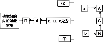 (6分) 下图表示组成细胞内几种重要有机物的元素、化合物之间的关系,其中a、b、d表示小分子物质,A、B、C、D表示大分子物质,请据图分析回答: